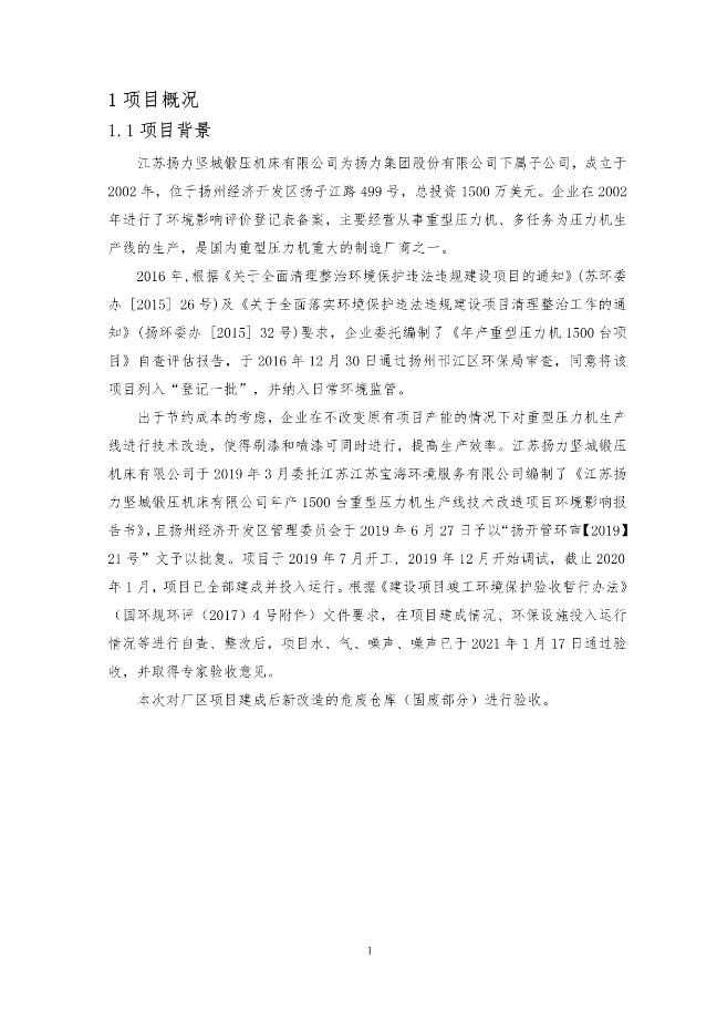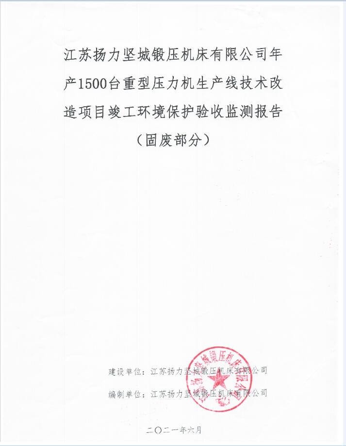 江蘇揚(yáng)力堅城鍛壓機(jī)床有限公司年產(chǎn)1500臺重型壓力機(jī)生產(chǎn)線技術(shù)改造項(xiàng)目竣工環(huán)境保護(hù)驗(yàn)收監(jiān)測報告(固廢部分)
